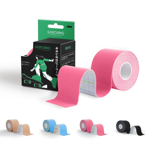 SAROSING キネシオロジーテープ 伸縮タイプ 50mm×5m|防水加工・低刺激粘着剤|スポーツ用テーピングテープ 膝・腰・手首サポート|通気性メッシュ構造で長時間快適 (ピンク)
