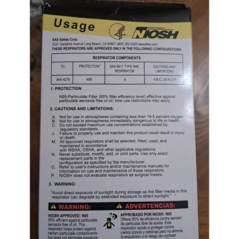 This box contains 20 N95 flat fold particulate respirators made by SAS Safety. The model number is 8617 and they have been approved by NIOSH for their effectiveness. These masks are designed to be disposable and are ideal for use in medical or industrial settings where airborne particles may pose a hazard. The brand is SAS and the specific model is 8617.