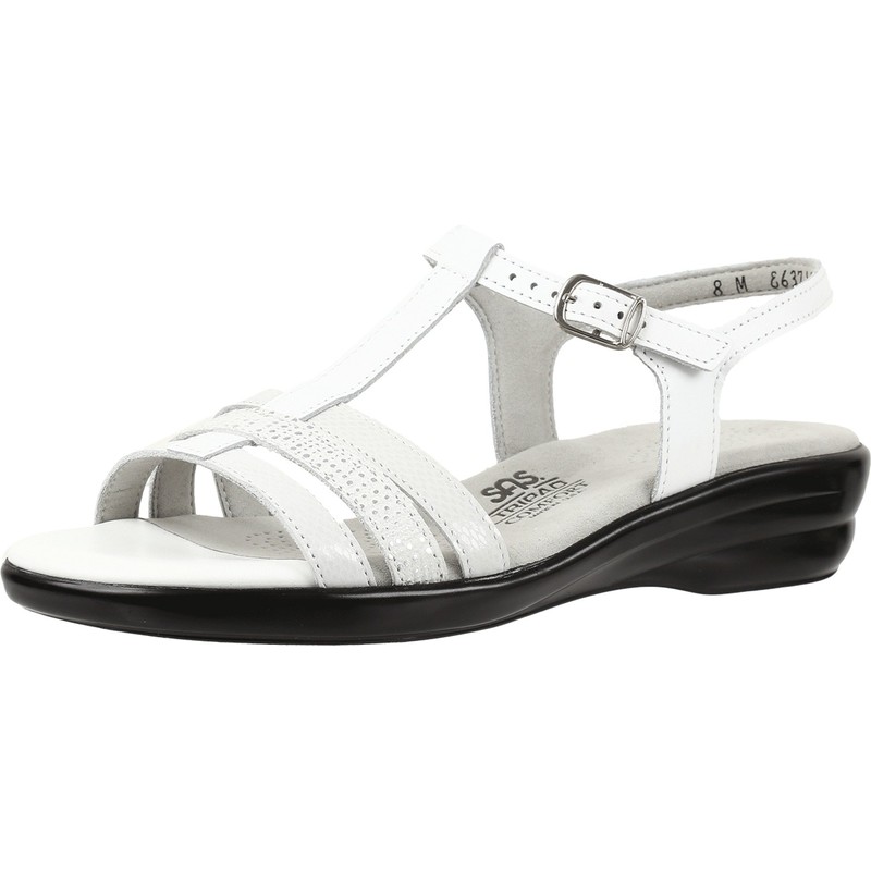 Complete your weekend look with the effortless style of the SAS Capri T-Strap Comfort Sandal. Beautiful leather and snake-print leather uppers. Adjustable buckle closure allows for a custom fit. Roomy toe box. Comfortable leather lining offers a great next-to-skin feel. Contoured footbed is topped with soft Super Suede, and is molded to the natural curves of the foot. SAS Tripad Comfort System cushions three pressure points of the foot, and delivers odor-fighting freshness. Man-made wedge. Supersoft lightweight sole features a wider base to provide enhanced stability and optimal shock absorption. Made in the U.S.A.