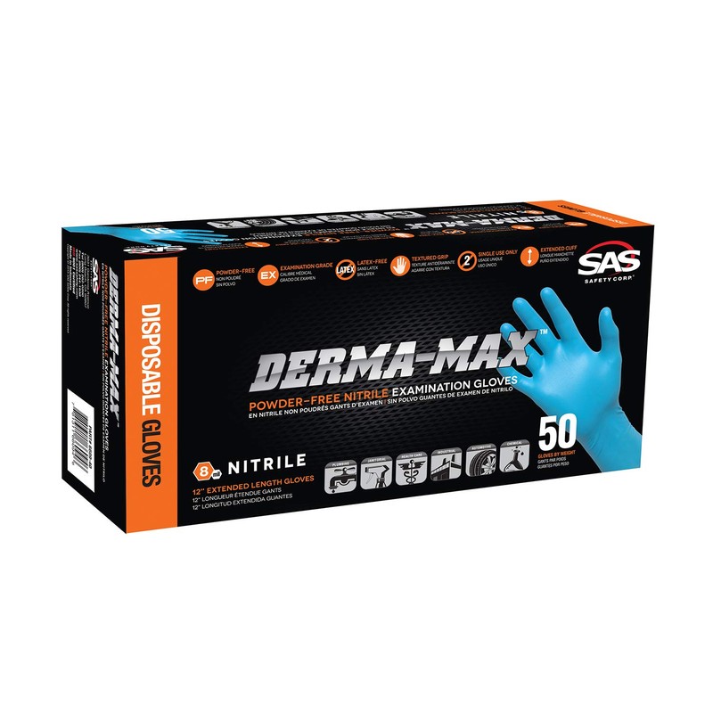Derma-Max powder-free nitrile exam grade disposable gloves are 8 mil thick for durability and 12" in length for added protection. Textured fingers allows for a superior grip of pneumatic tools. Non-latex and excellent sensitivity. Ideal for janitorial, marine, plumbing, painting, automotive and chemical resistance. Includes 50 gloves per box. For over 30 years, SAS Safety Corporation has provided safety products and equipment designed to make workplaces safer. We are dedicated to providing quality products that protect and preserve our most valuable resource: people. We offer a complete line of personal protective equipment; eye and face, hand, body, respiratory and hearing protection, as well as first-aid kits, ergonomic, spill control, and traffic safety products.