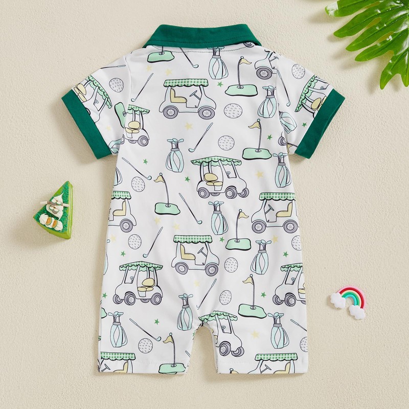 Baby Boys Golf Print Jumpsuit Short Sleeve Turn Down Collar Button Up Casual Romper