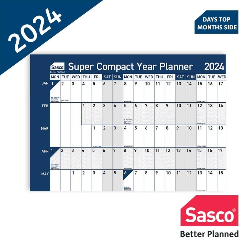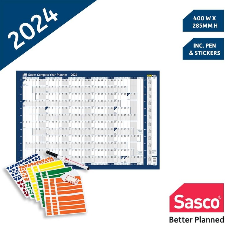 - Contents: 1 x Sasco 2024 Compact Year Wall Planner, poster style daily planner, Blue, measures W400 x H285mm, with wet wipe marker pen, pen clip and sticker pack included (2410217)