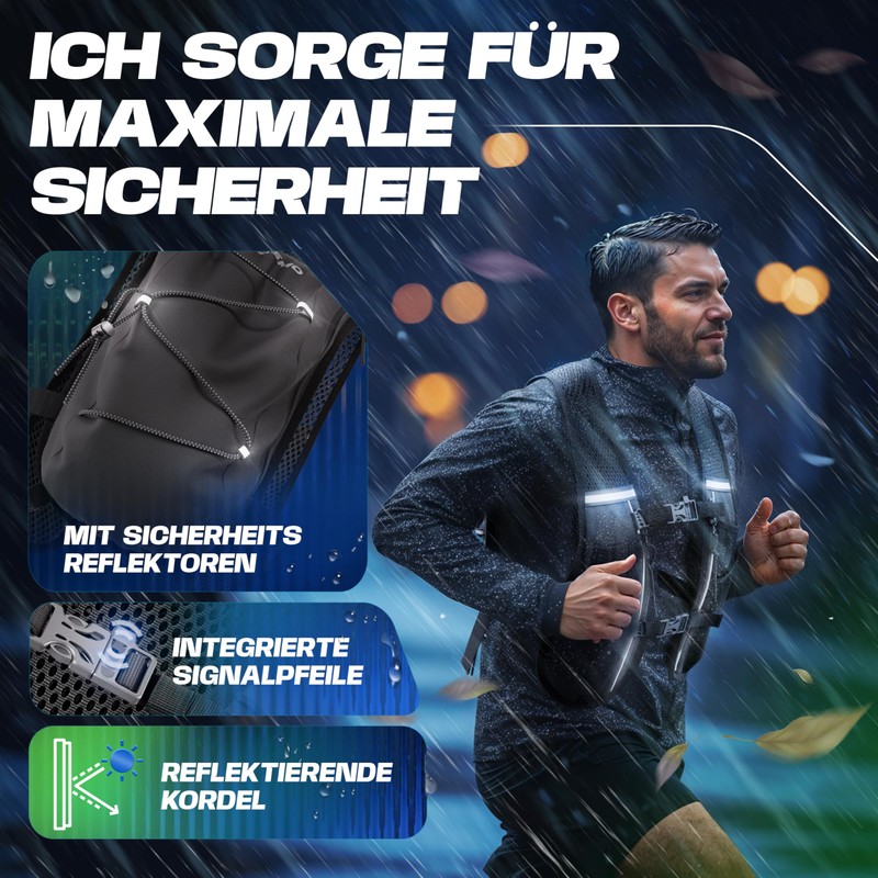 - ✔️ Maximum visibility and safety - The hydration backpack running offers reflectors, safety whistle in the chest strap and a reflective cord. The running hydration vest protects you optimally in the dark, trail runs and ultras.