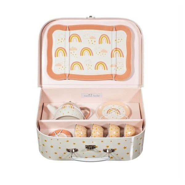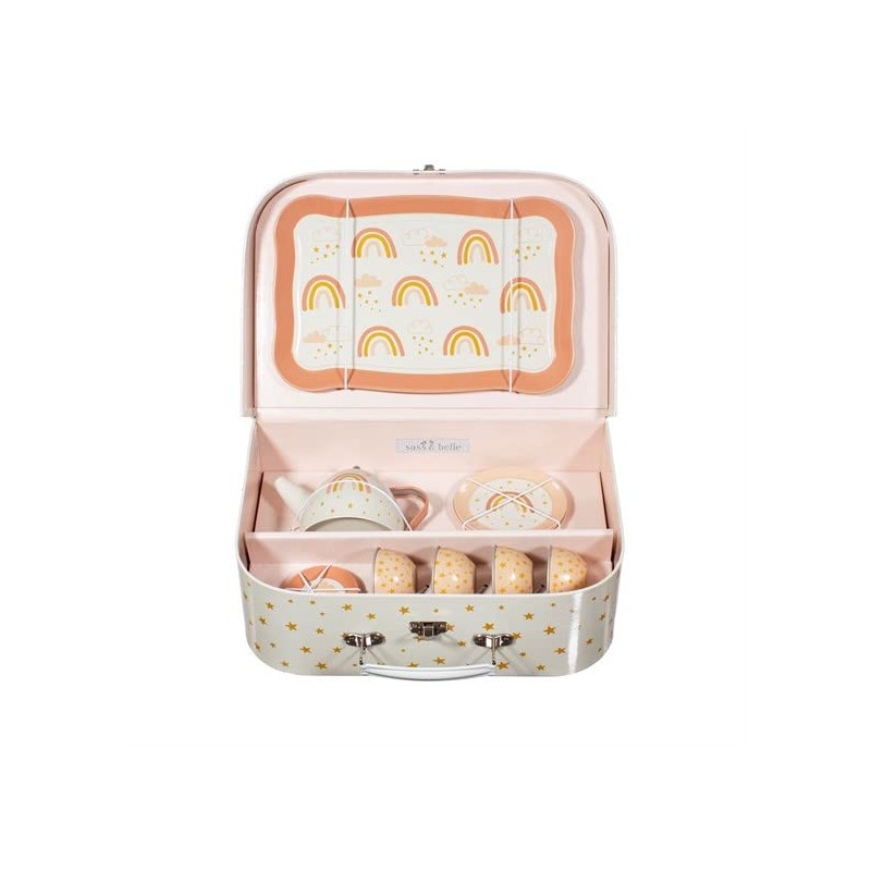- Enjoy a softer take on the popular rainbow motif across this wonderful tea set. Including a tray, teapot, small plates, and four cups and saucers.