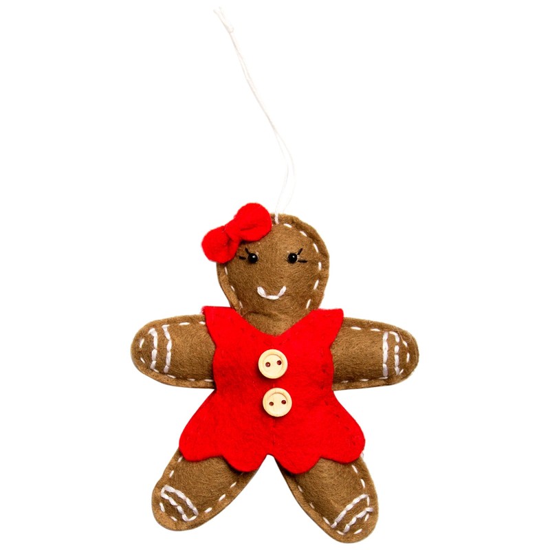 • This felt Gingerbread girl decoration wears a red dress with two buttons and a bow tie in her hair
