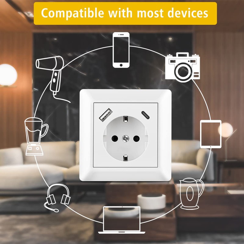 - 3 in 1 earthing contact socket: the combined Schuko socket with USB port and type C port, which has a Type-C charging port option more than conventional USB socket. Can charge 3 devices at the same time and compatible with most devices such as smartphone, tablet, MP3 etc.