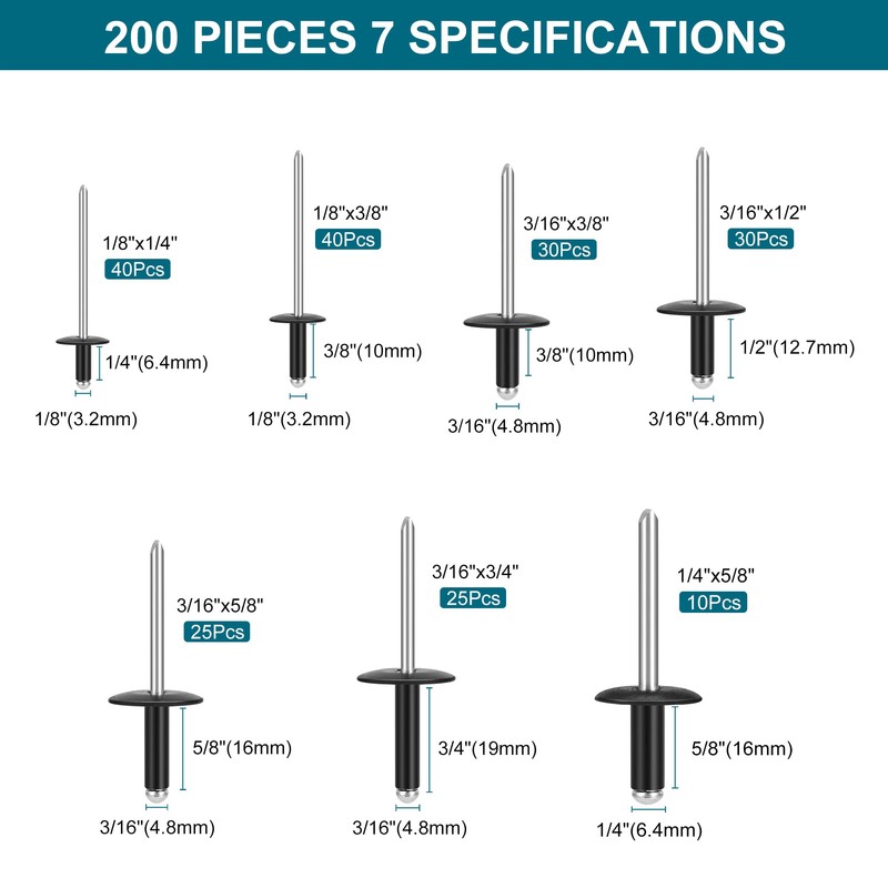 【200pcs 7 Standard Sizes】This pop rivets assortment kit includes 200 pieces 7most used sizes for your various needs. Including 40pcs 1/8’’ x 1/4”, 40pcs 1/8” x 3/8”, 30pcs 3/16” x 3/8”, 30pcs 3/16” x 1/2”, 25pcs 3/16” x 5/8”, 25pcs 3/16” x 3/4”10pcs 1/4” x 5/8”, total 200pcs.