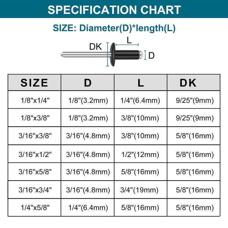 【Excellent Riveting Performance】: Large flange blind rivets increase the force area and ensure stronger riveting force, more stable and safer. These rivets are standard SAE size, well matched to the rivet gun, perfect for joining various metal plates and pipes, strong and durable.