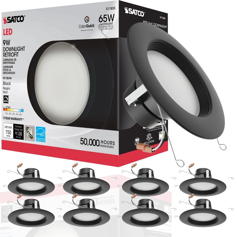 Satco (8 Pack) Led Color Selectable Downlight Retrofits, Part Number S11835, 9 Watt; 5 Inch - 6 Inch; Cct Selectable; 120 Volts; Dimmable; Black Finish for Industrial and Commercial Use