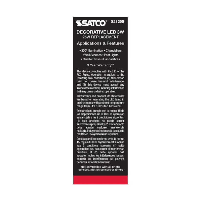 A 3-watt LED CA10 bulb with a frost finish and a candelabra base that produces a warm white light.This 3-watt LED CA10 bulb produces a warm white light that is ideal for creating a cozy and inviting atmosphere in your home. The frost finish on the bulb diffuses the light, making it softer and more evenly distributed. It is also long-lasting, with a lifespan of 15,000 hours. The Satco S21295 is also energy efficient, using only 3 watts of power to produce a brightness that is equivalent to a 40-watt incandescent bulb.