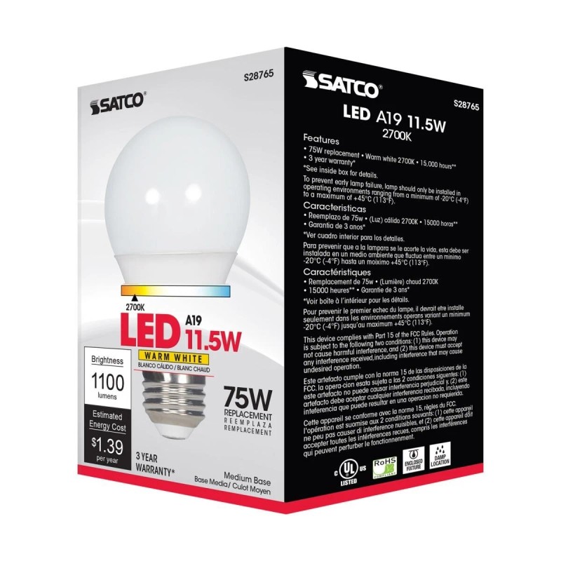 Satco S28765 - 11.5 Watt A19 LED Frosted Bulbs - 2700K - 120 Volts (6 Pack)