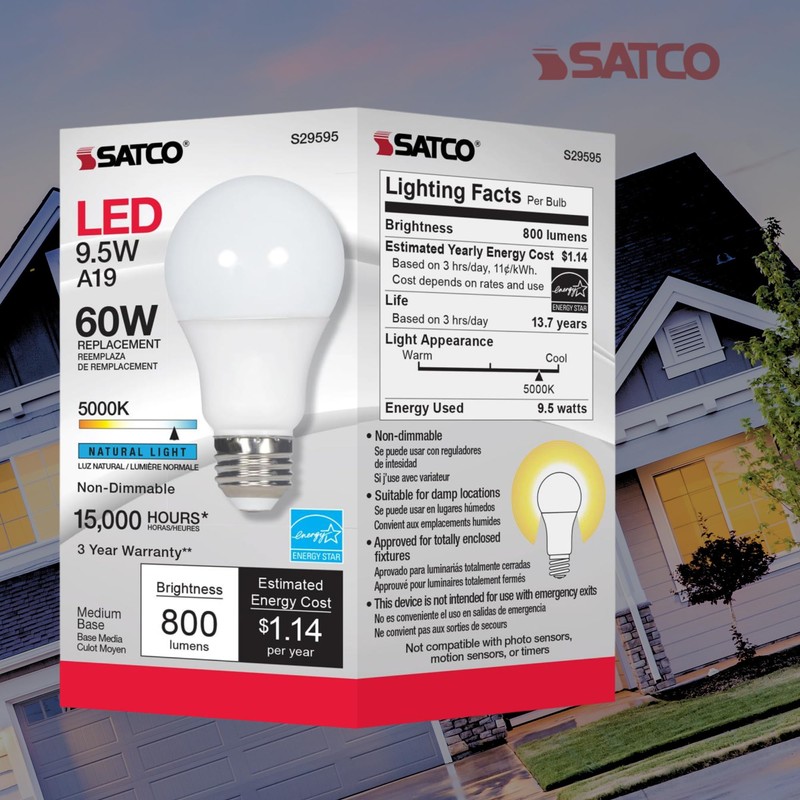 Satco S29595 9.5W A19 LED Light Bulb, 5000K Daylight, E26 Medium Base, 800 Lu...
