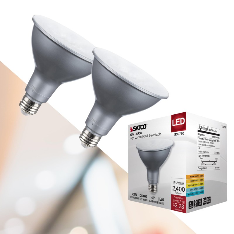 Satco S39760 19 Watt PAR38 High Lumen LED; 27K/30K/35K/40K/50K CCT Selectable; Medium Base; 120-277 Volt (2 Pack)