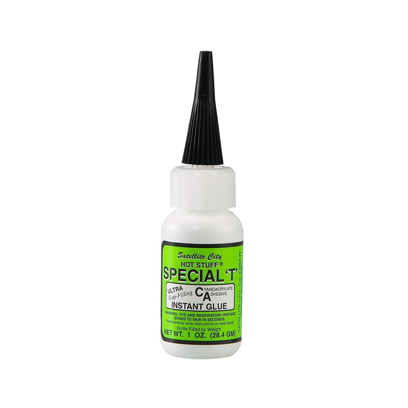 Special T THICK gap-filling CA glue (green label) has a viscosity (1150-1500) similar to honey. Special T works great when you use it to bond both porous and non-porous parts, and it can fill larger gaps than our Super T medium CA glue. It is best used for parts that are missing pieces or don’t fit very well together. You can bond the same materials as with our other CA glues- wood, metal rubber, nitrile, composites, many types of plastics- and Special T is effective even when a poor fit makes parts look impossible to bond. The gap- filling capability is very useful when there is a large chunk missing from a surface- filling that space with Special T can preserve the structural integrity, seal the area from moisture and contaminants, bond something to the exterior that would not fit otherwise, cover and protect jagged edges, and improve the look of the surface.