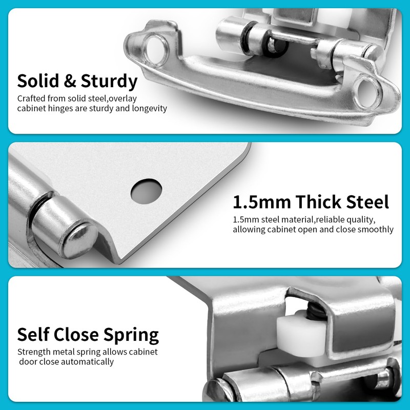 - Features - Self closing, semi-concealed, variable overlay hinge. Designed for 1/2" Overlay Door Hinges only. The distance between the two installation holes is 2-1/8 inches, ideal replacements for most hinges, you don't need to drill new holes again.