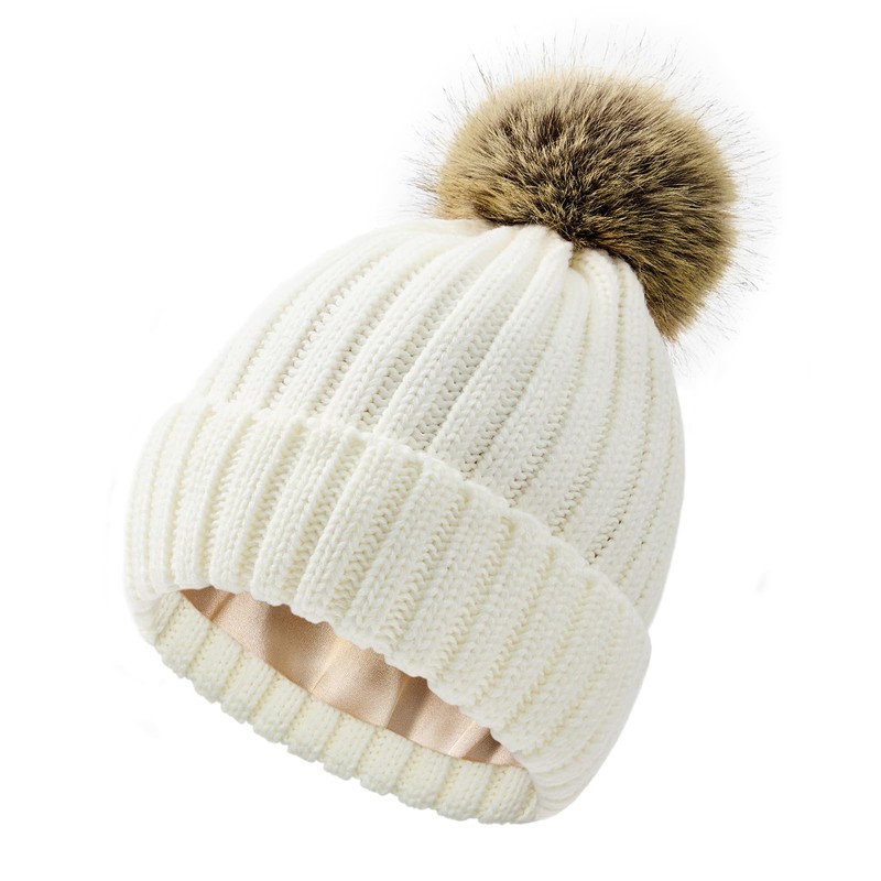 Satin Lined Beanie for Women White Knit Winter Hats Silk Lined Warm Soft Womens Beanie with Detachable Pom Pom