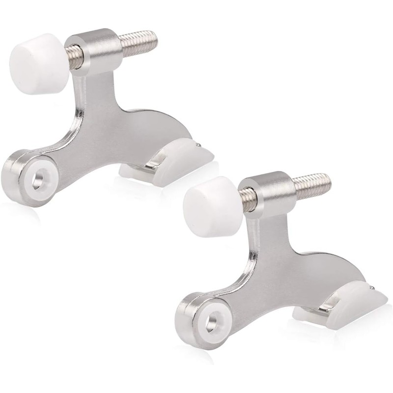Satin nickel hinge pin door stopper with adjustable rubber bumpers designed to control door swing and help protect walls and doors without drilling. Includes 2 pieces.