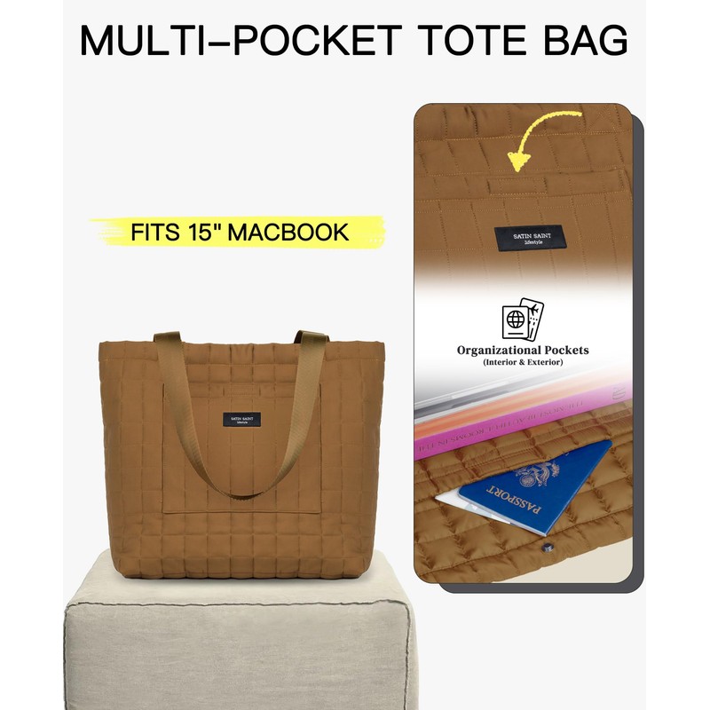 SATIN SAINT Women's 35L Puffer Lightweight Quilted Tote - Unisex Gym & Travel Bag, Carmel Brown