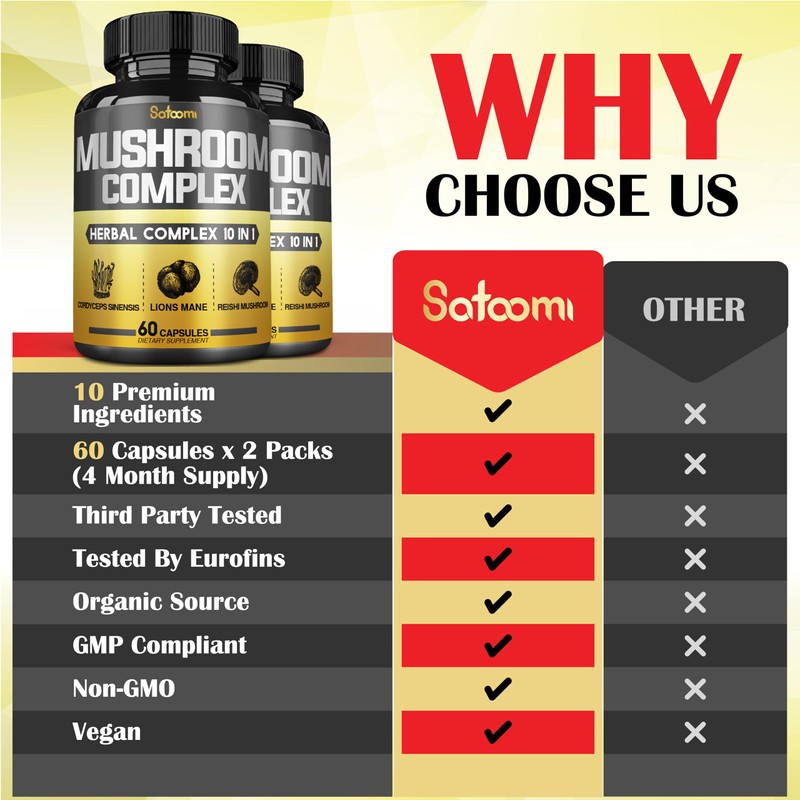 - 🍄 Trusted Quality: Satoomi Mushroom Capsules are 3rd-party tested for purity and manufactured in a cGMP-certified facility to ensure premium quality. Guaranteeing high-value natural health products for you and your family.