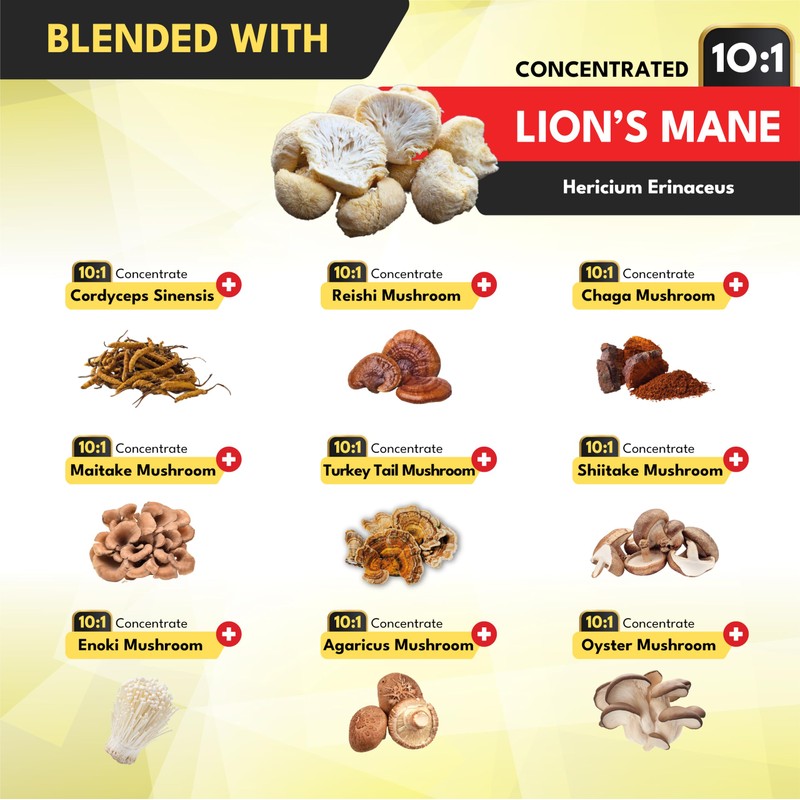 - 🍄 10in1 Formula: Mushroom Supplements are blended from Lions Mane, Cordyceps Sinensis, Reishi, Chaga Mushroom, Maitake Mushroom, Turkey Tail Mushroom, Shiitake Mushroom, Enoki Mushroom, Agaricus Mushroom, Oyster Mushroom