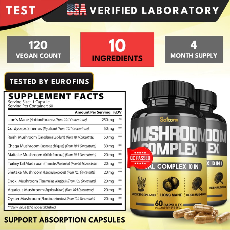 Satoomi 10in1 Mushroom Complex Supplements Capsules - 4 Month Supply - Blends with Lions Mane, Cordyceps, Reishi, Chaga, Maitake, Shitake & Others - 2 Packs 60 Capsules