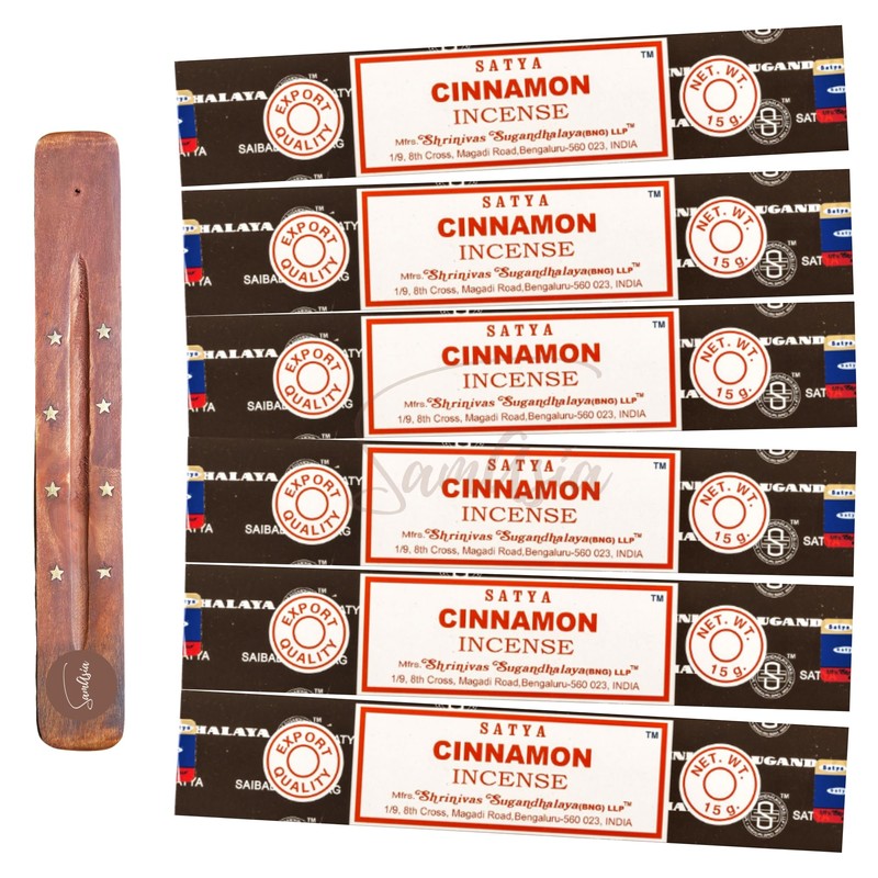 Satya Nag Champa Cinnamon Incense Sticks | x6 pack | with SAMASIA incense sticks holder | Used for Aromatherapy, Spa, Yoga, Weddings, Meditation, Healing, Positivity and Relaxation