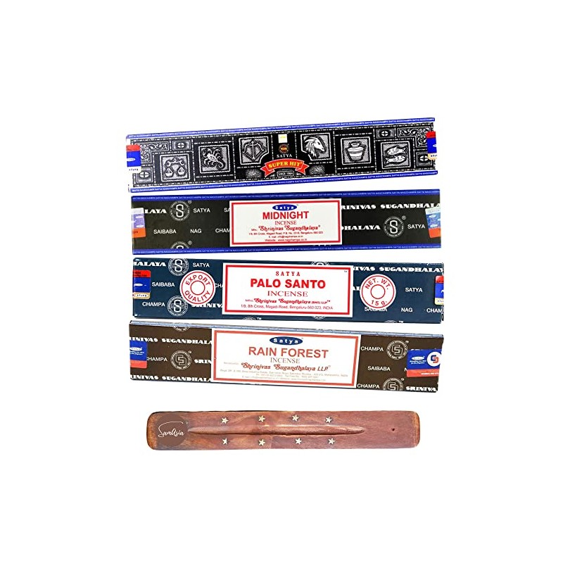Satya Nag Champa Incense Sticks - 4 unique and premium flavours - Super Hit, Midnight, Palo Santo, Rain Forest and comes with SAMASIA incense holder