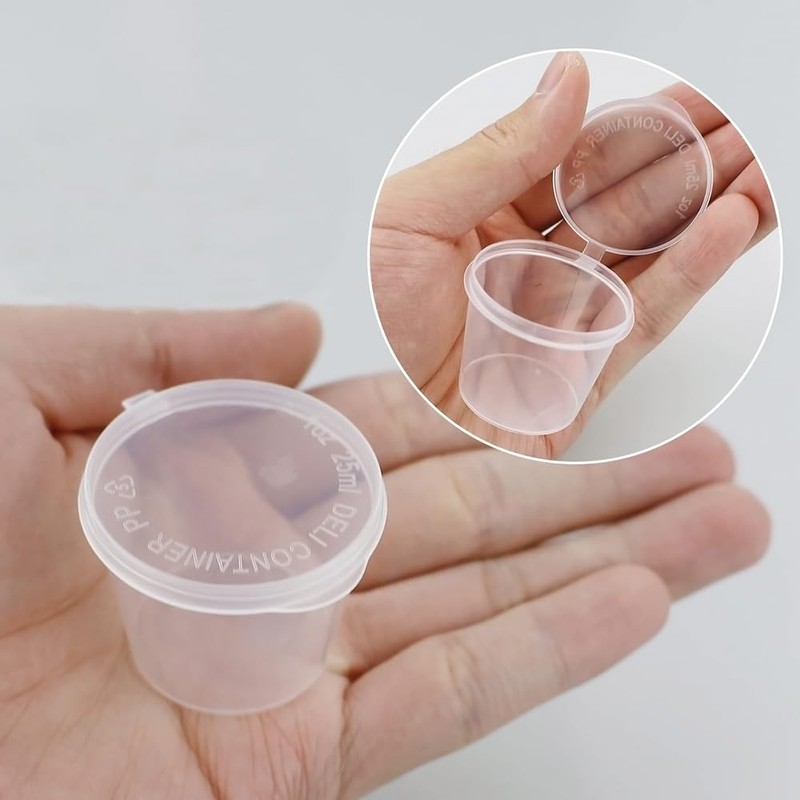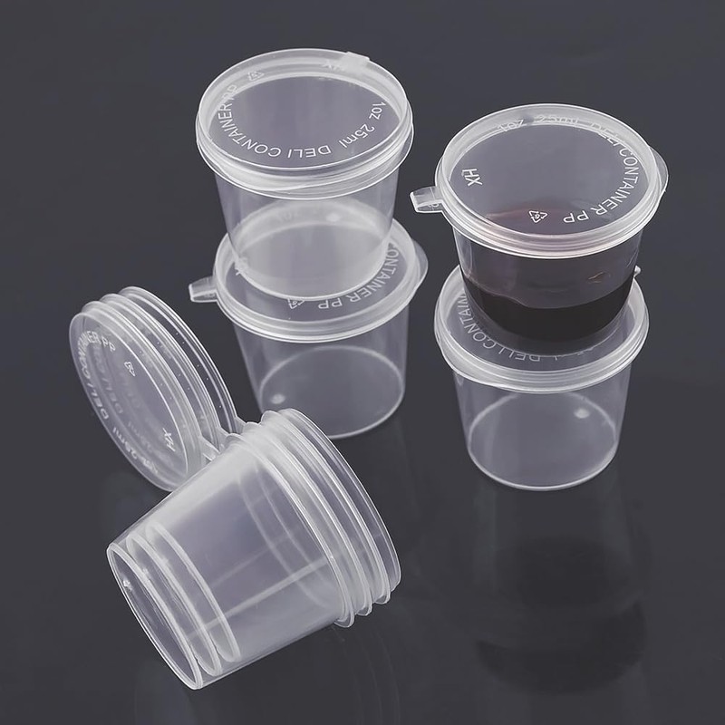 Sauce Pots with Lids, 100 Pcs 1oz / 25ml Plastic Small Containers for Salad Dressing Sample Snack Jelly Takeaway Sauce and Paints, Reusable Deli Cups Sauce Pot with one-piece Lid