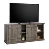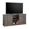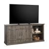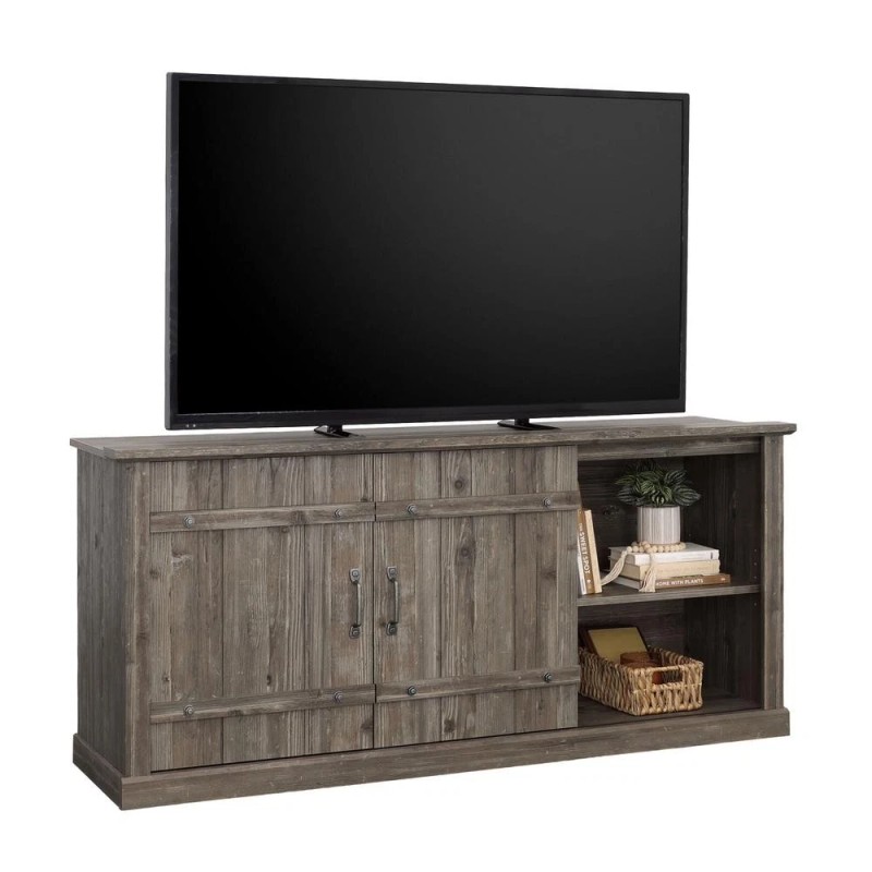 With an old-fashioned style inspired by the family farm, this TV stand with sliding doors from the Sauder Select collection harkens back to a time of simple country charm. Three adjustable shelves in this TV stand make it the perfect place to store a collection of movies or family games, a stack of magazines, or seasonal decor. All can be hidden by two barn doors that slide open for easy access and customizable storage. This TV credenza accommodates up to a 70" TV weighing up to 95 lbs., making your living room the perfect place for game nights or watching sports with family or friends. This TV stand with storage also includes cord management through the enclosed back panel so you can keep all your wires tidy and out of sight. This farmhouse TV stand with be the focal point of your living room. Finished in Pebble Pine and accented with rustic inspired hardware, this credenza TV stand will bring the peaceful farm country into your home.