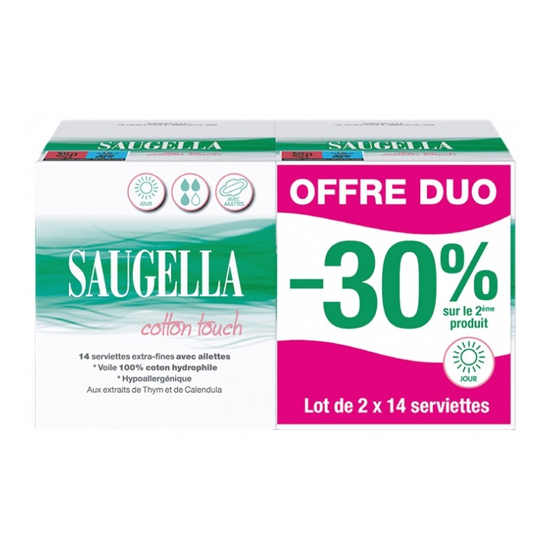 Saugella Cotton Touch Day 2 x 14 Extra-Fine Napkins with Fins are hypoallergenic napkins, with a 100% hydrophilic cotton veil and enriched with natural thyme and calendula extracts for maximum comfort.