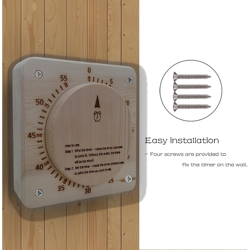 - [AUDIBLE & VISIBLE]: With this timer installed in your sauna room, you can indulge in your relaxation without the need to constantly watch a timer and waste energy. Unlike typical sand timers, this audible and visible timer operates on a mechanical core, eliminating the need for batteries or electric power.