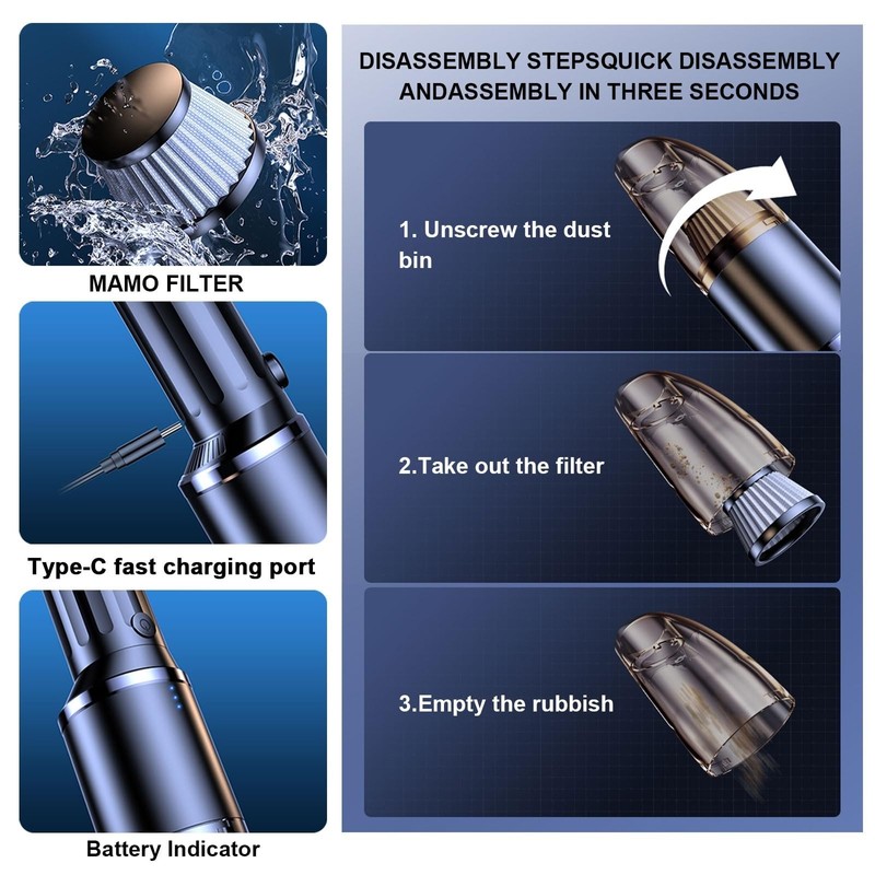 One-Touch empty design of the mini hand vacuum helps you dump dust easier, just need to slide the button down. No getting your hands dirty. Transparent design makes the dust collecting process visible and reminds you of cleaning in time.