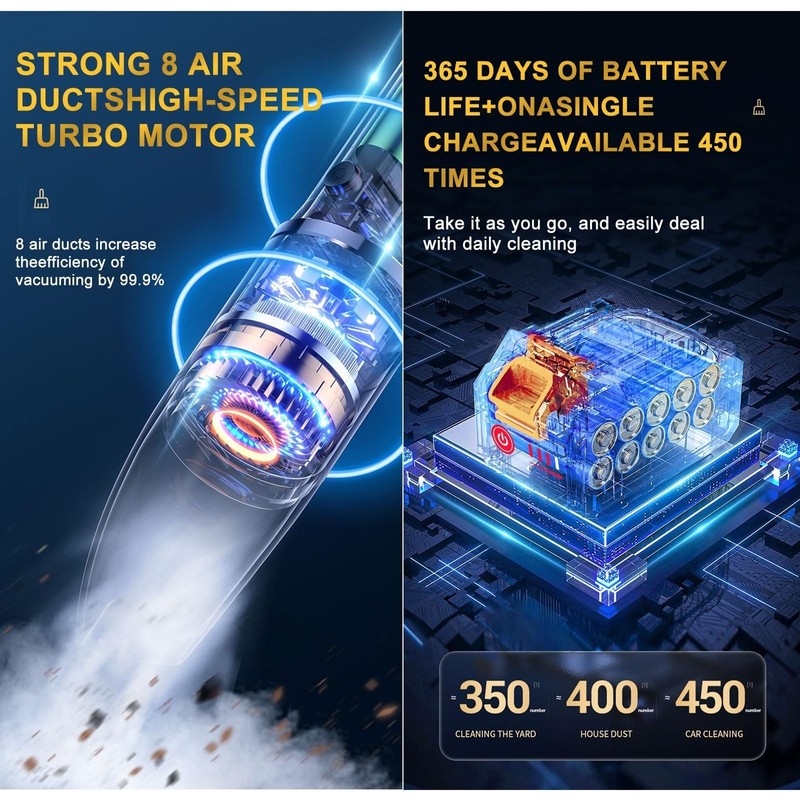- DETACHABLE DESIGN--Always forget to charge your small car vaccum? The handle(with battery inside) of this hand vacuum cordless rechargeable is detachable. With size of 4.92 x 1.65in and weight of 0.3lb, convenient for you to put the compact handle into pocket to take it home or restaurant for charging. The handle can also be taken out of your car in hot days to avoid high temperature for safety reasons.