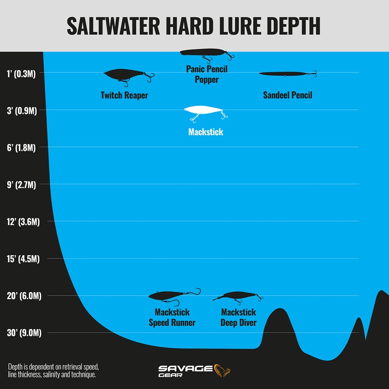 - PRODUCT SPECIFICATIONS: Lure Size: 2 oz, 5in | 13cm. Hook Size: 3/0. Rigging: Trebles. Color: Blue Mackerel. Swimming Depth: 1'-3' | 0.3m-0.9m. Available in 5 colors.