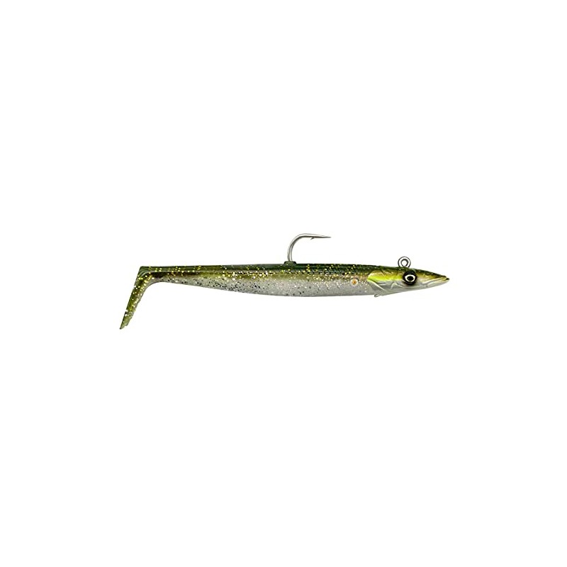 Savage Gear Sandeel V2 - 2 rubber fish + 1 jig head. The artificial bait from Savage Gear is a realistic sand eel imitation with lively striking action, both in sinking and when tightening, which tempts even the most careful predators to bite. The unique Rise & Stand Up jig head ensures an attractive run: the bait rises on pull and stands upright at the bottom. The Pro Peg body holder allows the body to be secured to the head by toothpick. The soft plastic body is pre-assembled with a glass rattle that gives the bait a provocative sound.