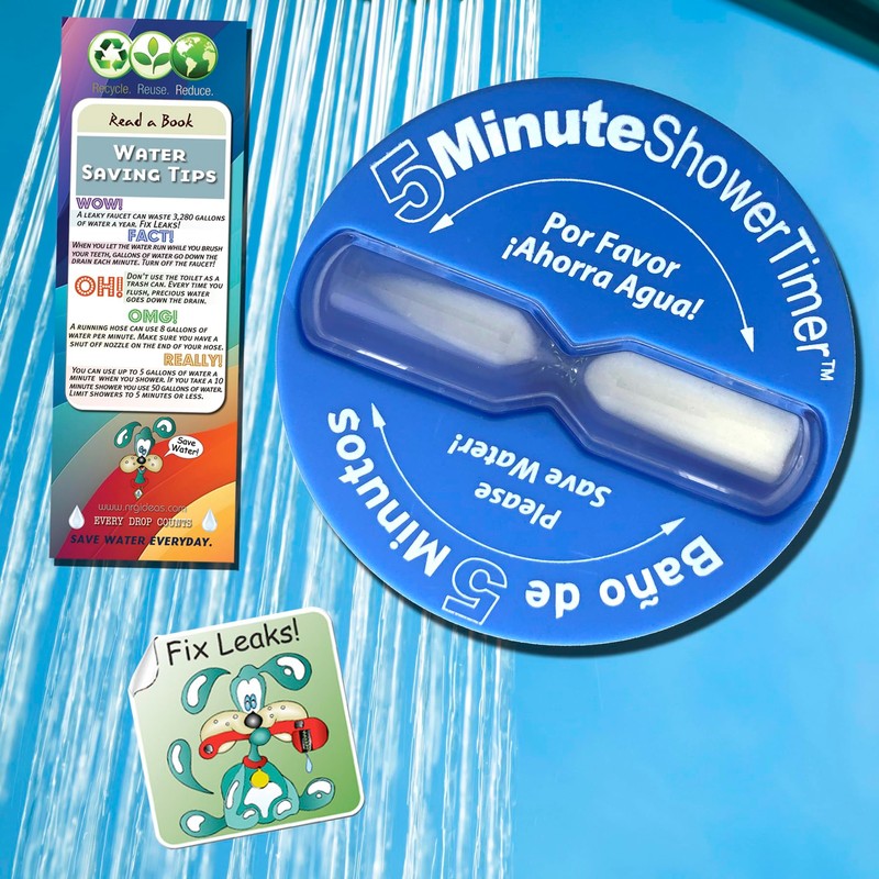 Save water and money with this handy Spanish-English shower timer. It's a simple and effective tool to help you shorten your showers, reduce water usage and save money. When the sand runs out, it's time to get out! All you do is place the suction cup on any non-porous surface and then swivel the timer every time you take a shower. Time approximately = five minutes per turn. Color may vary. Our shorter shower sand timer helps you beat the clock and save! Simply turn the timer on its suction cup backing to know when five minutes are up. Save water and save money with this handy and durable conservation device. Perfect for getting into the habit of a quicker and more efficient shower. Blue housing standard with sand timer and shatter-proof plastic cover.