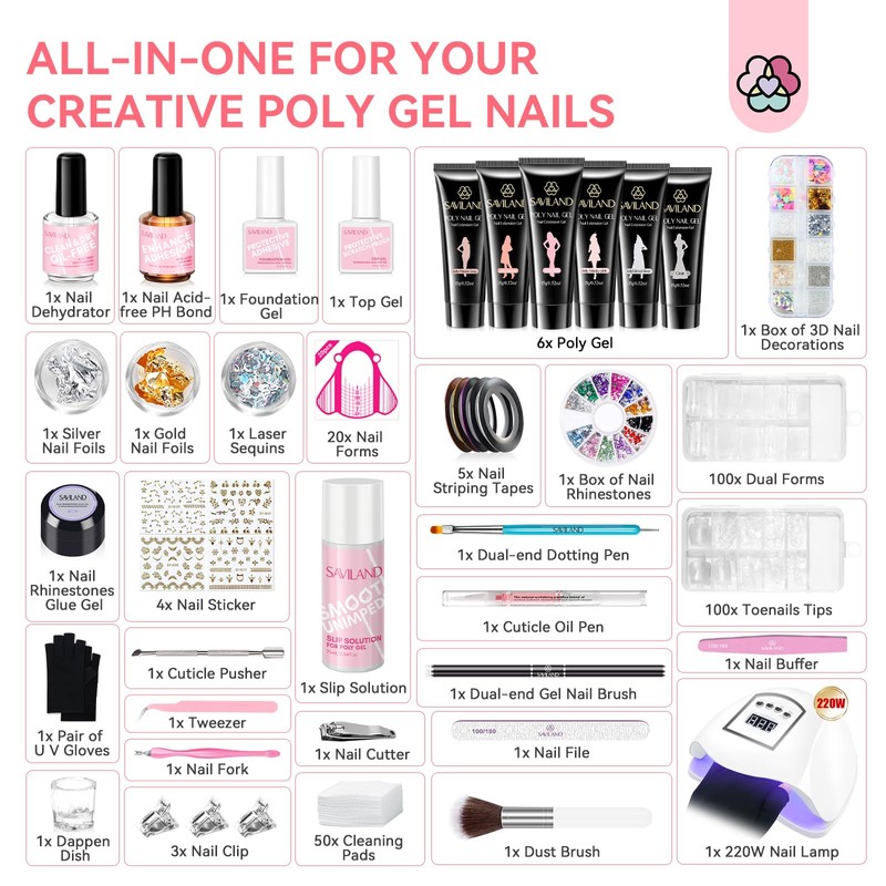 - ALL-IN-1 POLY GEL NAIL KIT: Saviland all-in-1 poly gel nail kit contains 6 charming colors of poly extension gel, 10ml base & top gel, 100pcs dual forms, 1*dual-end nail brush, 1* nail file, 1* 220W U V LED nail lamp, nail decoration and nail art tools. A perfect complete gel extension nail kit for lady home DIY and salon use.