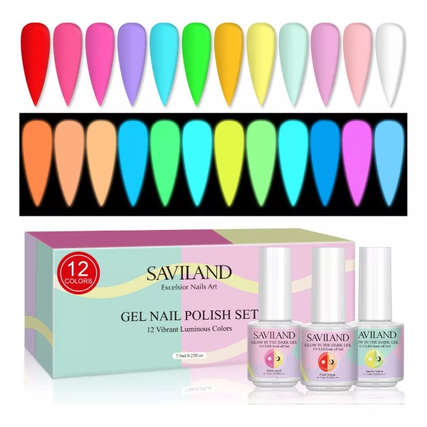 Saviland kit de esmaltes de uñas de gel, que brillan en la oscuridad, gel de neón luminoso de 12 colores, esmalte de uñas con efecto de brillo UV/LED, para diseño de uñas DIY.