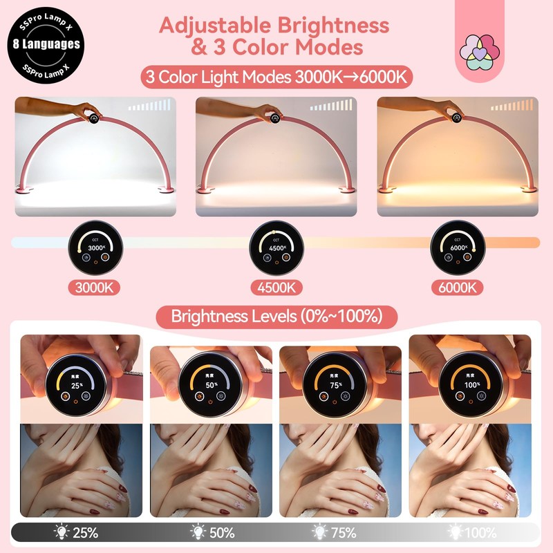 SAVILAND Half Moon Nail Light for Desk: Pink 48W 29In 8 Languages Display Screen Halfmoon Light with Phone Holder 3000-6000K Adjustable Aliminium 76 * 6 * 64cm Desk Light Nail Desk Lamp for Nail Art