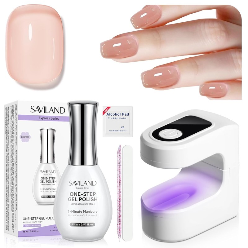 SAVILAND One-Step Gel Nail Polish Kit: Sheer Jelly Nude 5-In-1 Gel Polish Base Top Coat Builder Reinforcement In One Bottle with U V Light Quick Easy Manicure Home DIY Gift Travel Kit 15 ML