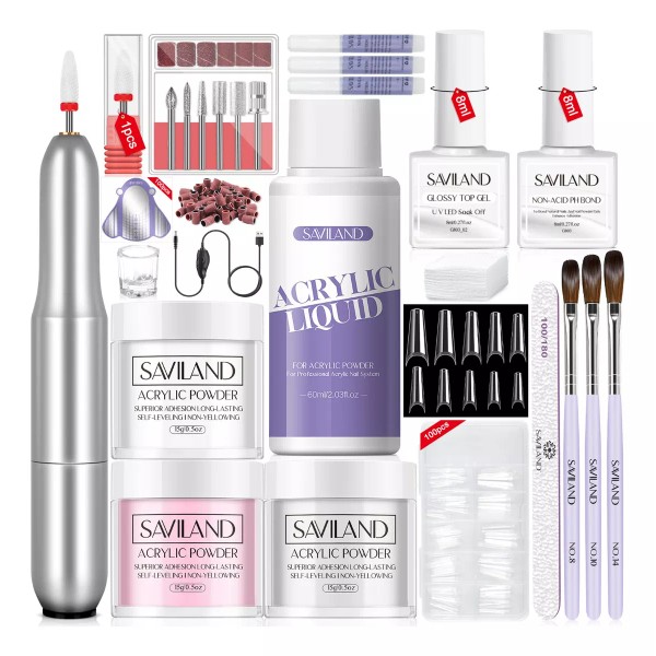 R: El kit de uñas acrílicas Saviland viene con 3 cepillos para uñas acrílicas (n. 8/10/14), que se pueden usar para tallar y polvo acrílico con recubrimiento plano.