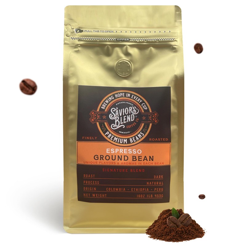 Savior's Blend Coffee Premium Espresso Ground Coffee, Dark Roast, Colombian-Ethiopian-Peruvian Blend, 16 oz