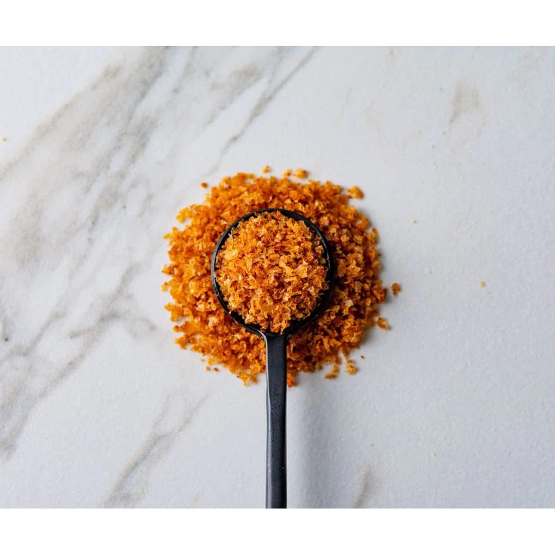 This fiery salt is handcrafted with our chile-head customers in mind. While it is a scorching blend, the salt to Ghost Pepper ratio tempers the intense bite of the chile. To best infuse the spicy heat and unique flavor in every granule, we use a liquid binder (similar to the process we use to make our vanilla sugars). After experimenting with a few different flavors, we found that chocolate extract gave the best balance. Chocolate and chile are a great pairing but our Ghost Pepper Salt does not taste like chocolate. The chocolate aroma prepares the palate for a blast of chile heat. While this doesn't alleviate the heat, it does make the impact more pleasant. Use anywhere you would add hot sauce. Fire up chicken wings, chili, and fajitas. Sprinkle on french fries, sliced watermelon, and deviled eggs. Add heat to rimming salt mixtures for cocktails. Flavors: This intensely hot seasoning salt is chocolatey, bittersweet, and earthy. Uses: Season chicken wings, chili, fajitas, and French fries. Use in place of hot sauce. Caution: This is HOT! Ingredients: Kosher salt, naturally flavored chocolate extract (propylene glycol, water, alcohol and natural flavor), ghost peppers Nutrition: Sugar- FreeGluten-FreeNut-FreeVegetarianVeganMSG-FreeDairy-FreeGarlic-FreeOnion- FreeSweetener-FreeBlack Pepper-FreeCorn-Free Ghost Pepper Salt - 1 Cup Bag | Savory Spice Shop