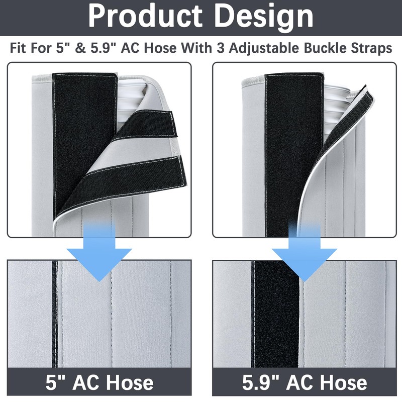 - Full-edge cover for portable AC hose sleeves with 3 elastic straps included.