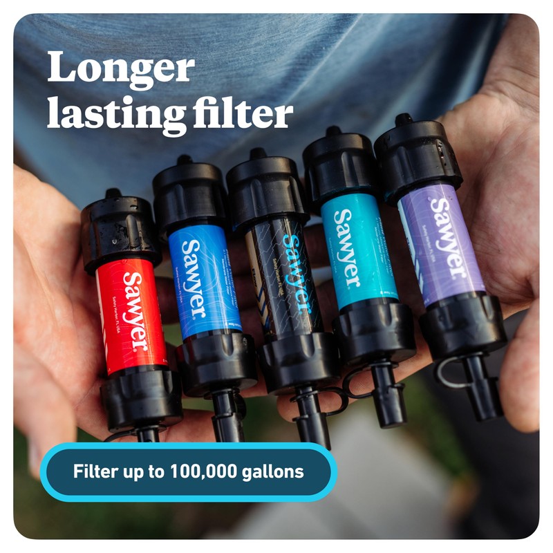 - Filter rated up to 100,000 gallons; includes four Sawyer MINI filters in various colors, four 16-ounce reusable squeeze pouches, four 7-inch drinking straws, and four cleaning plungers
