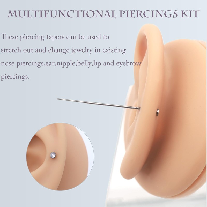 - Tapers Stretching Kit:All piercing kit tools are made of 316L stainless steel. Piercing tools make you change piercing jewelry more safe and easily, no harm to sensitive skin.