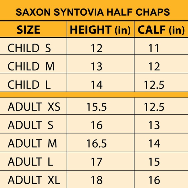 - Vegan Leather: The Saxon Syntovia Half Chaps are made from quality grained PU that looks and feels like real leather