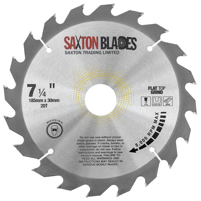Saxton Flat Top TCT Circular Saw Blade 185mm x 20T x 30mm Bore + rings Ring fits Bosch Makita etc