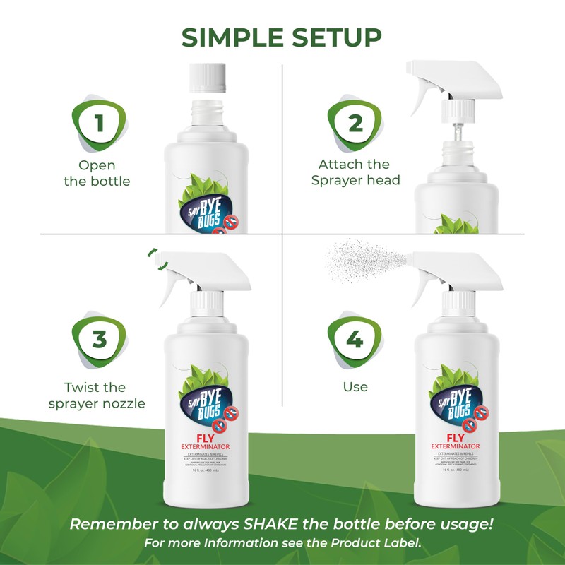 Say Bye Bugs Fly Exterminator. Non-Toxic Insect Killer That Eradicates on Contact & Provides Daylong Repellency. for Fruit Flies, Gnats and Other Flying Home Insects. Shake & Spray (1x 16oz). (16oz)