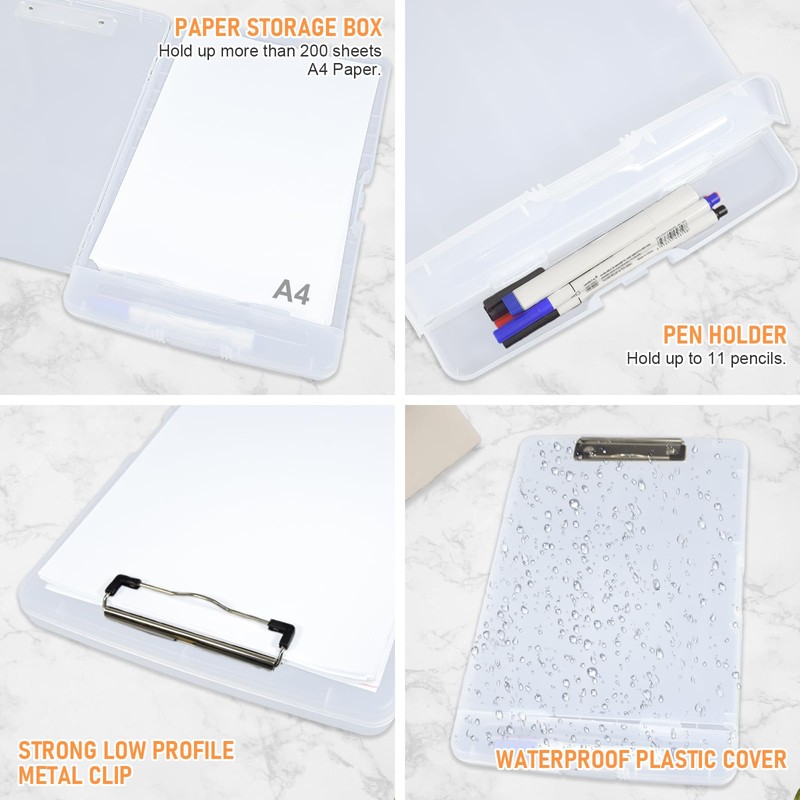The clipboard has built-in storage space in the form of a paper storage ox and a pen case, which can hold up to 200 letter-sized documents and 11 pencils.